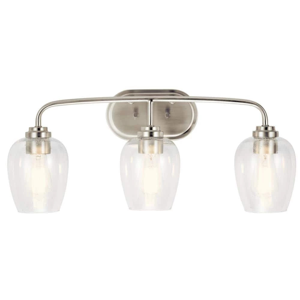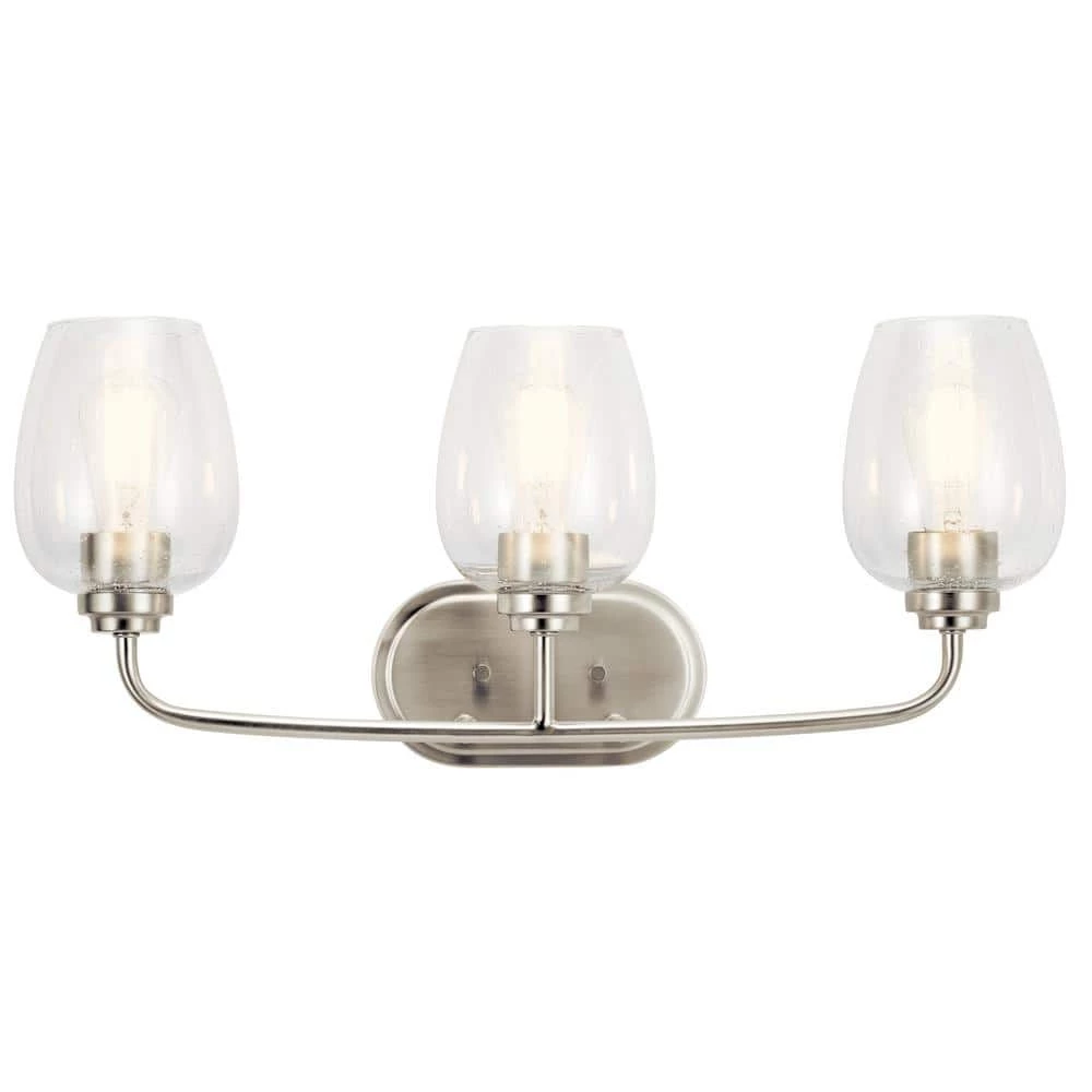 The Valserrano 24 in. 3-Light vanity Light features wine goblet shaped clear seeded glass shades with a clean design in Brushed Nickel finish. A perfect addition in several aesthetic environments including transitional, traditional or farmhouse decor. Complete the look by adding coordinating pieces from the Valserrano Collection.