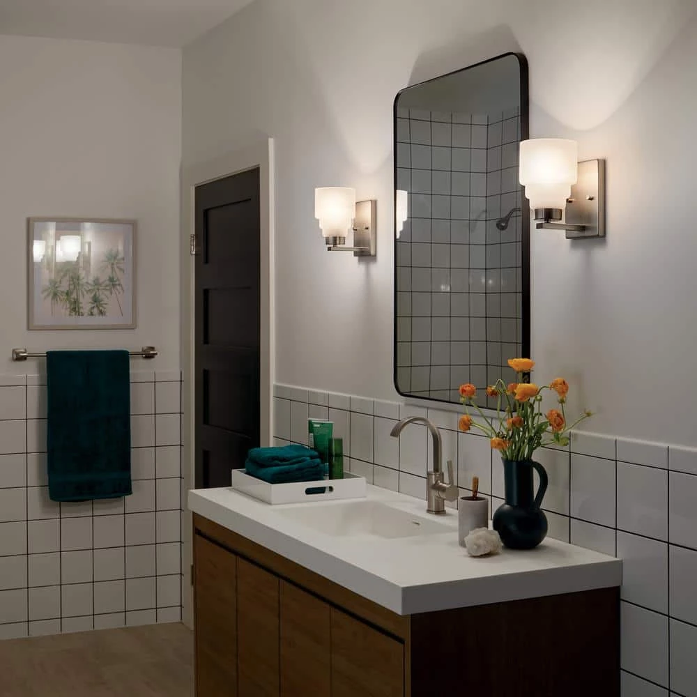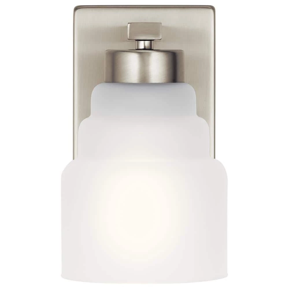 The KICHLER Vionnet 8.5 in. 1-Light Brushed Nickel Wall Sconce with Satin Etched Glass adds a contemporary touch to your space. It can be installed facing up or down as per your requirements: turn the shade down to highlight an accent piece or turn it up, towards the ceiling for a soft ambient light appeal. It features a brushed nickel finish that blends well with a variety of home decor styles, including contemporary and transitional. This exquisite wall sconce from KICHLER is sure to enrich the decor of your living room, bedroom or more.