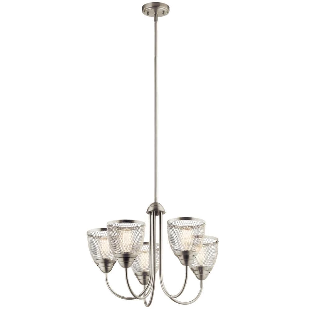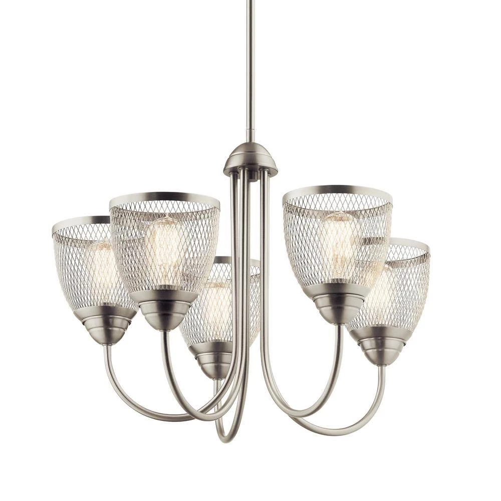 The Kichler Voclain 17.5 in. 5-Light Brushed Nickel Chandelier features metal mesh shades that create a unique light pattern and an industrial-style look. It has an elegant brushed nickel finish that complements various styles of decor. This chandelier is made from durable steel and is rated for safe use in dry locations.