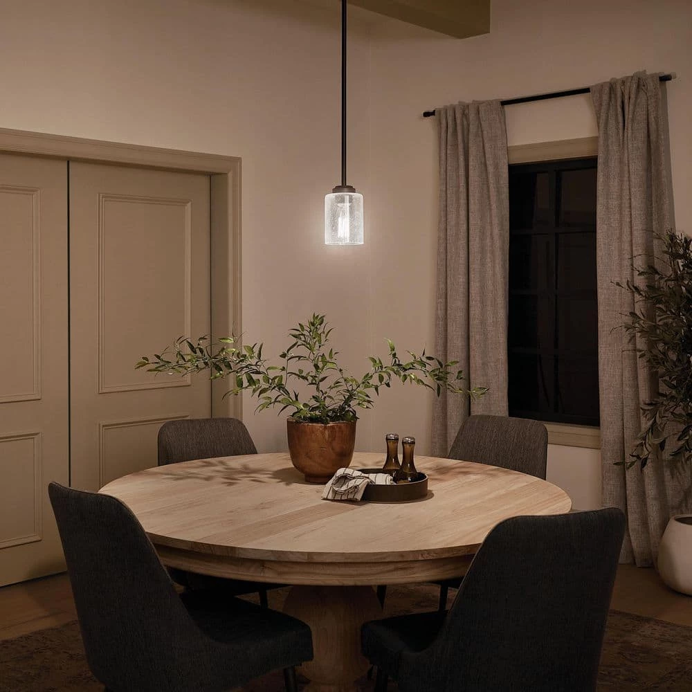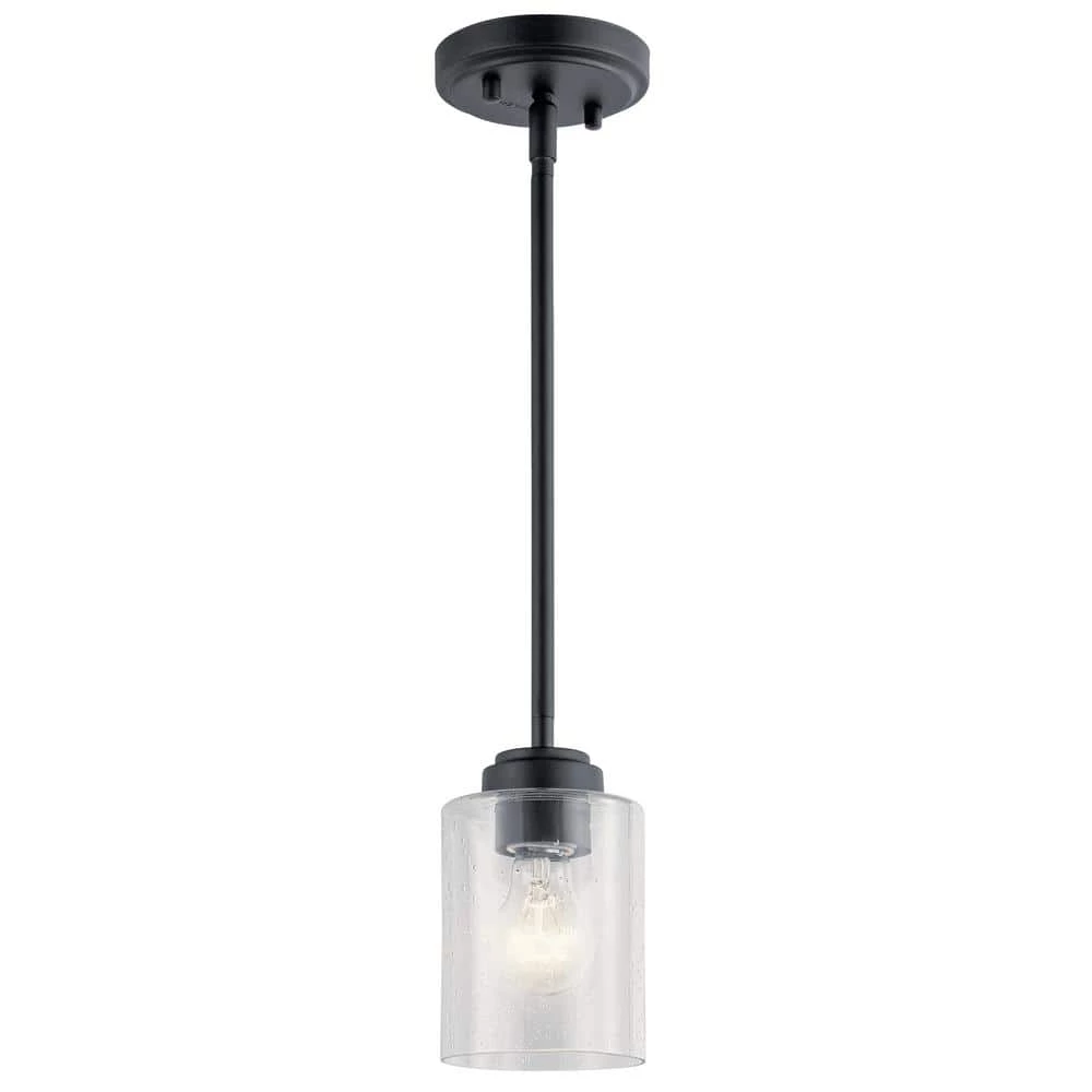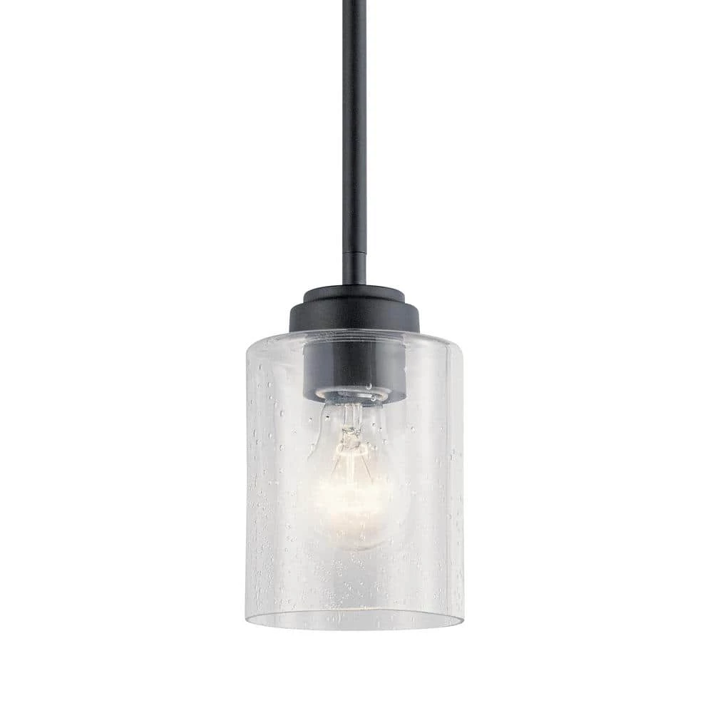 The KICHLER Winslow 7 in. 1-Light Black Mini Pendant is ideal for your living room or dining room. It features an elegant design that accentuates the visual appeal of your contemporary-style decor. The mini pendant has a clear seeded glass diffuser that provides bright illumination.