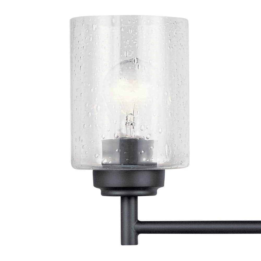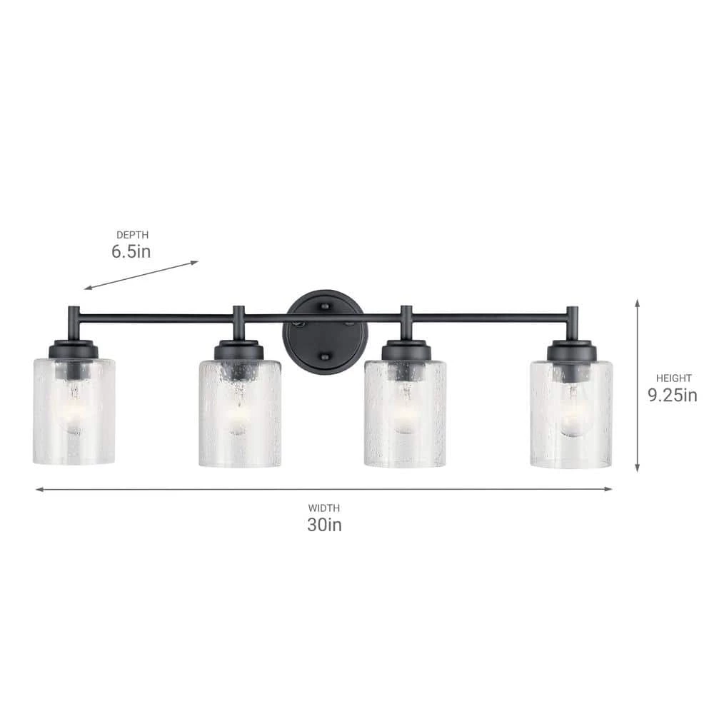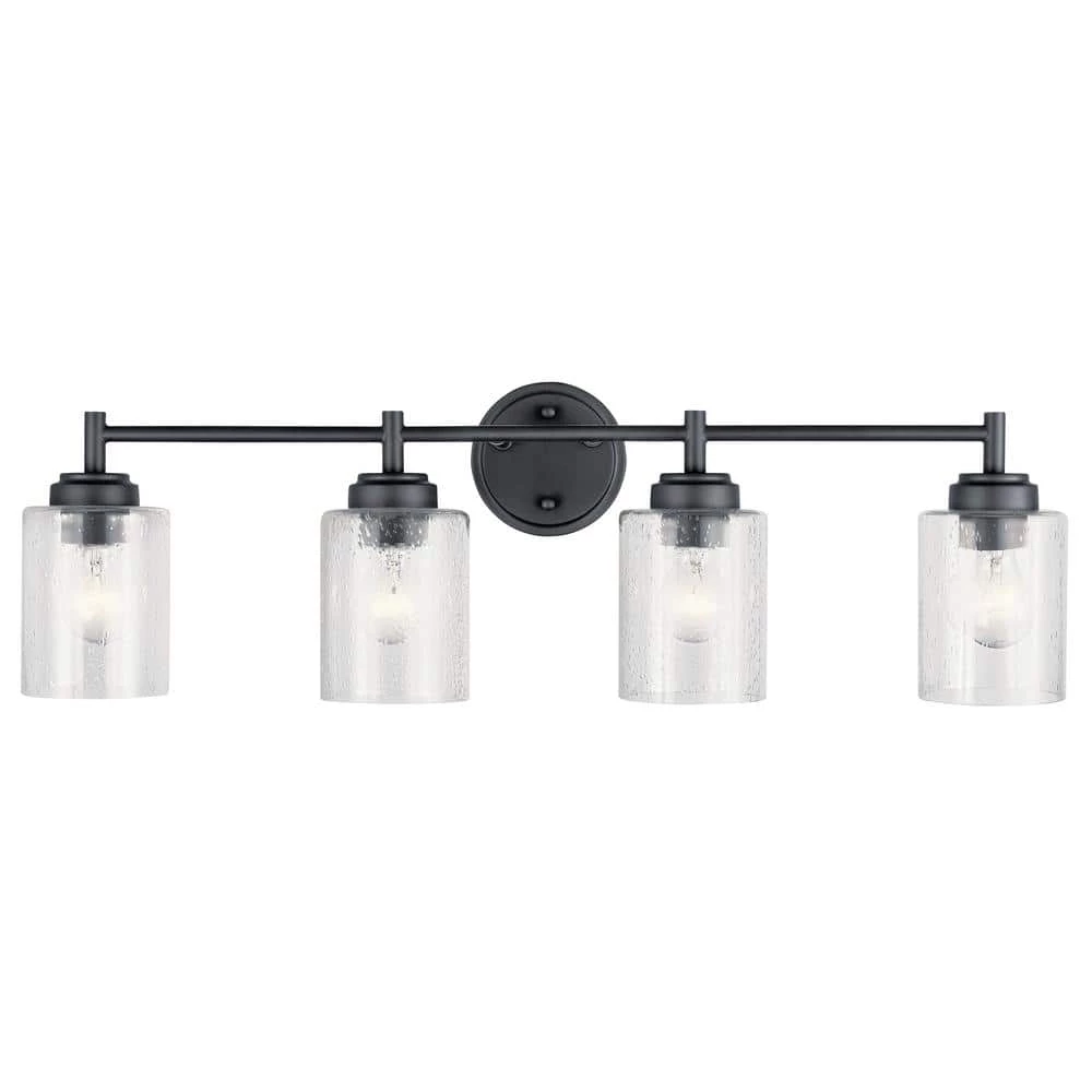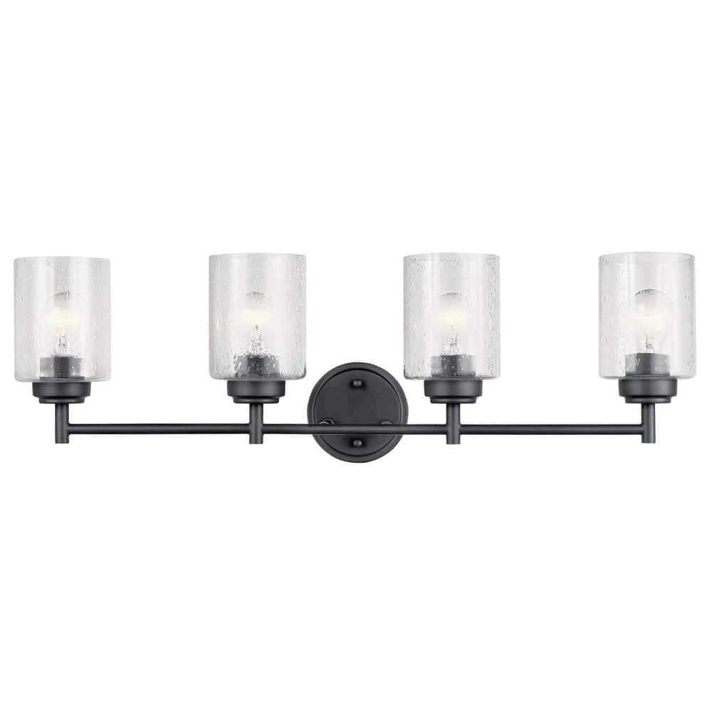 The KICHLER Winslow 30 in. 4-Light Black Vanity Light with Clear Seeded Glass adds an elegant touch to your bath space. You can hang the glass shade upwards or downwards depending on your usage: simply turn the shade up for soft ambient light or turn it down to highlight the mirror. This vanity light from KICHLER is suitable for use in damp locations.