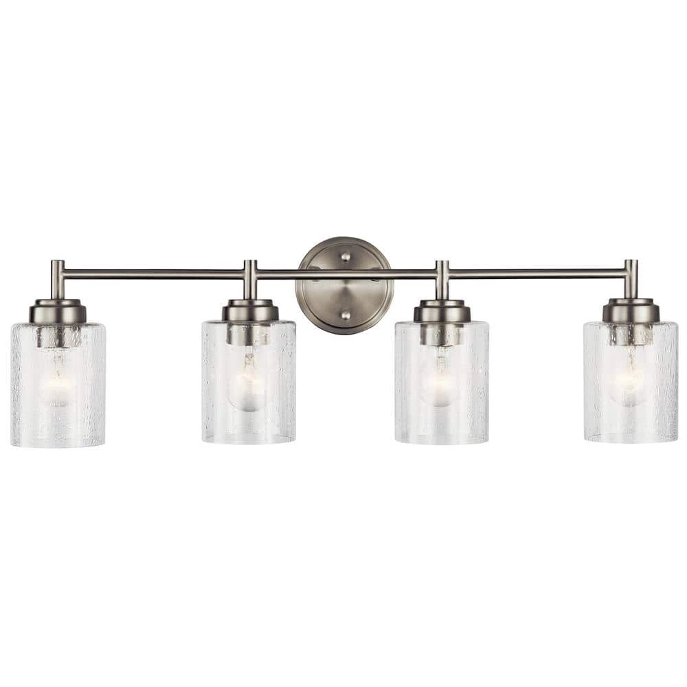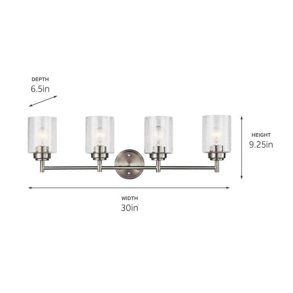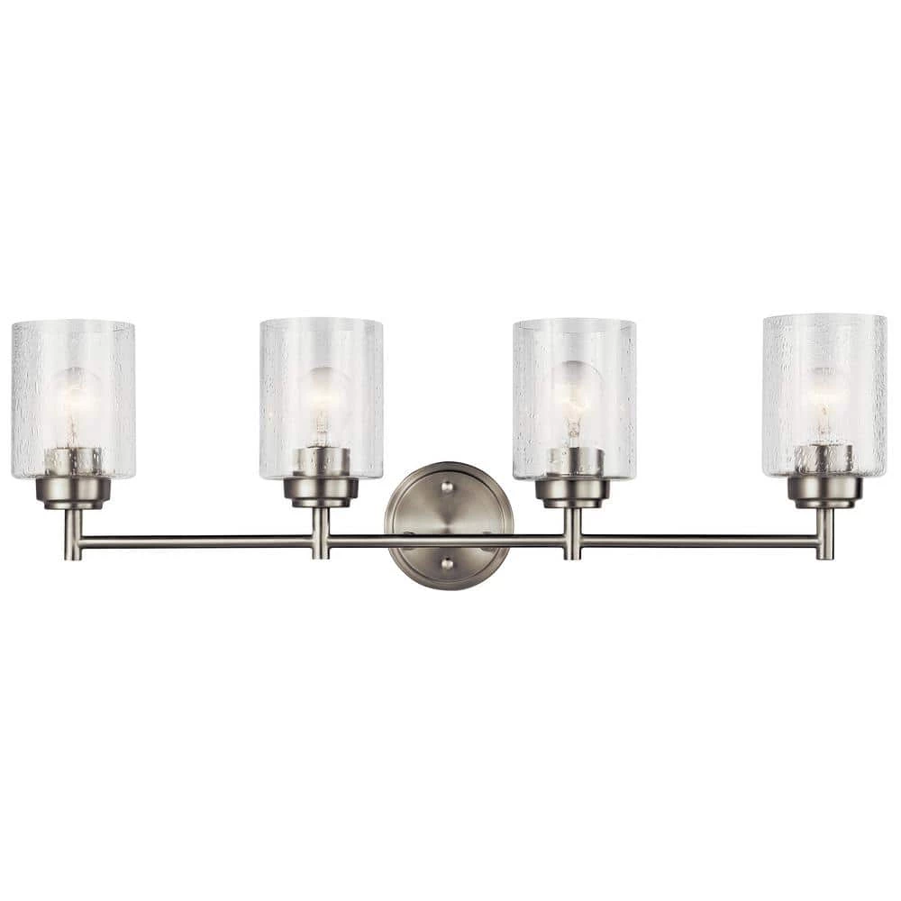 The KICHLER Winslow 30 in. 4-Light Brushed Nickel Vanity Light with Clear Seeded Glass adds an elegant touch to your bath space. You can hang the glass shade upwards or downwards depending on your usage: simply turn the shade up for soft ambient light or turn it down to highlight the mirror. This vanity light from KICHLER is suitable for use in damp locations.