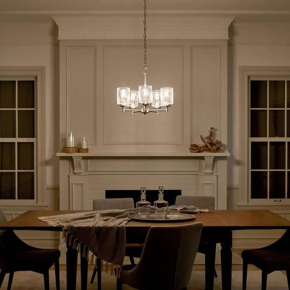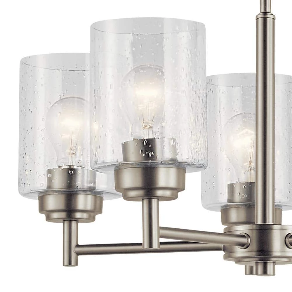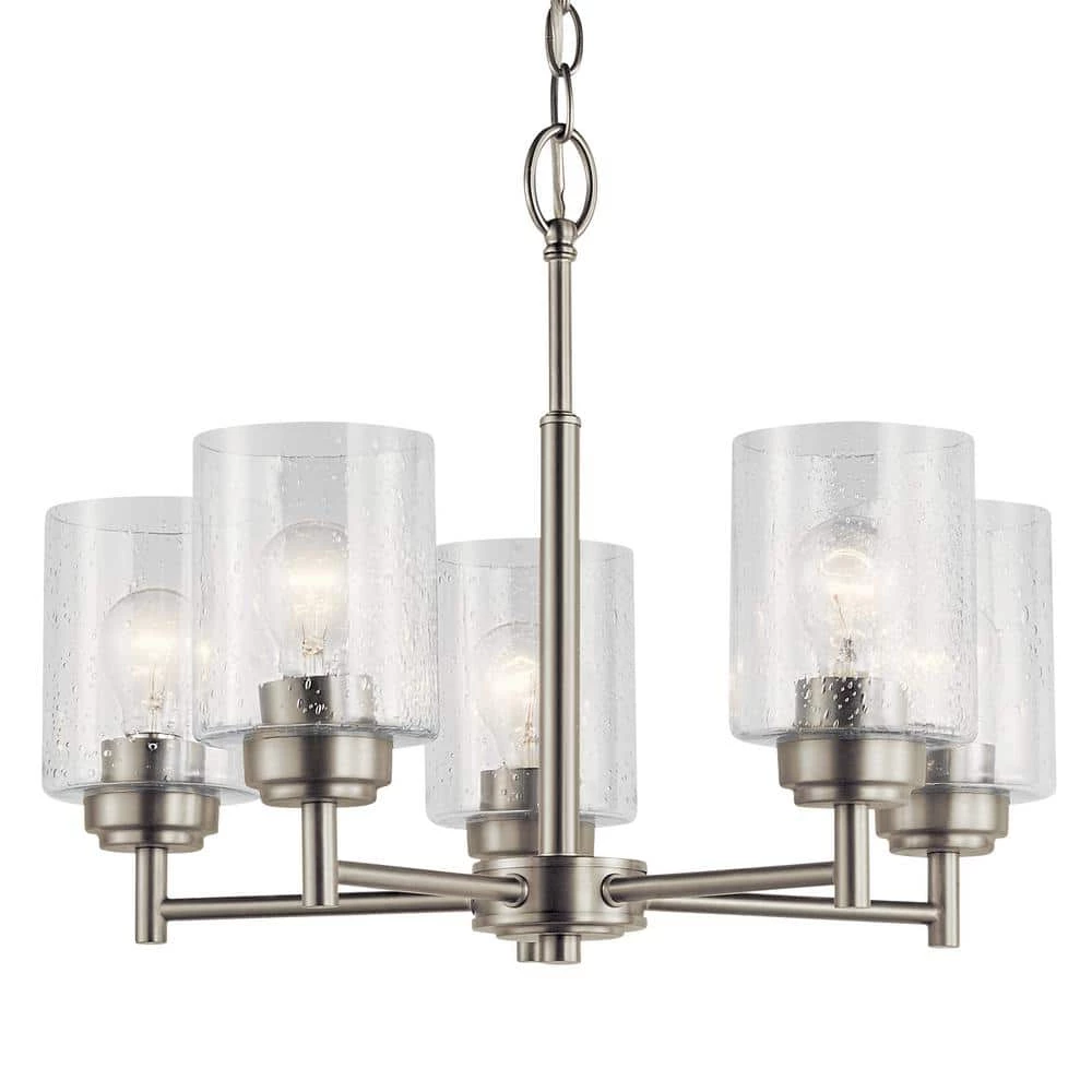 Enhance the visual appeal of your decor with the Kichler Winslow 19.75 in. 5-Light Brushed Nickel Mini Chandelier. It features an elegant design with a brushed nickel finish that is sure to accentuate any contemporary-style decor. The clear glass diffusers of this chandelier provide bright illumination to add a radiant glow to your space. This chandelier can be installed with the glass facing up or down to create beautiful ambient lighting.