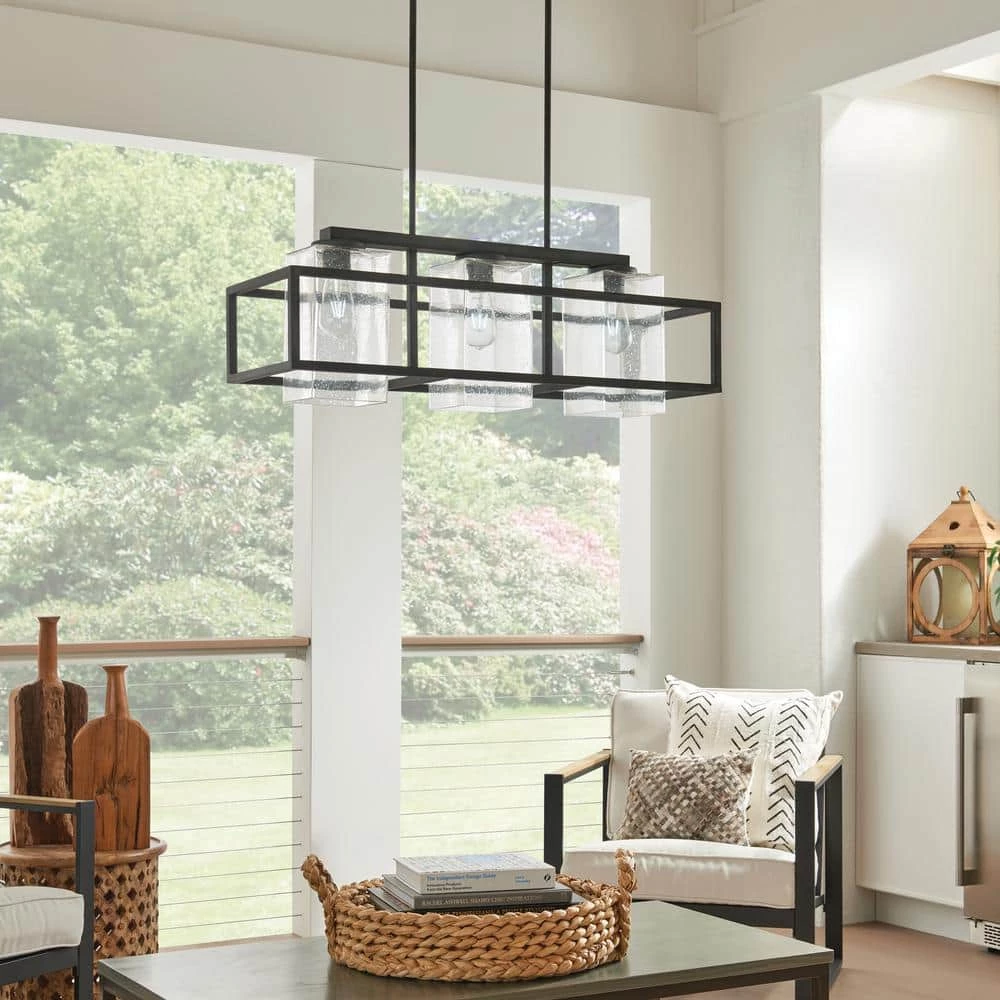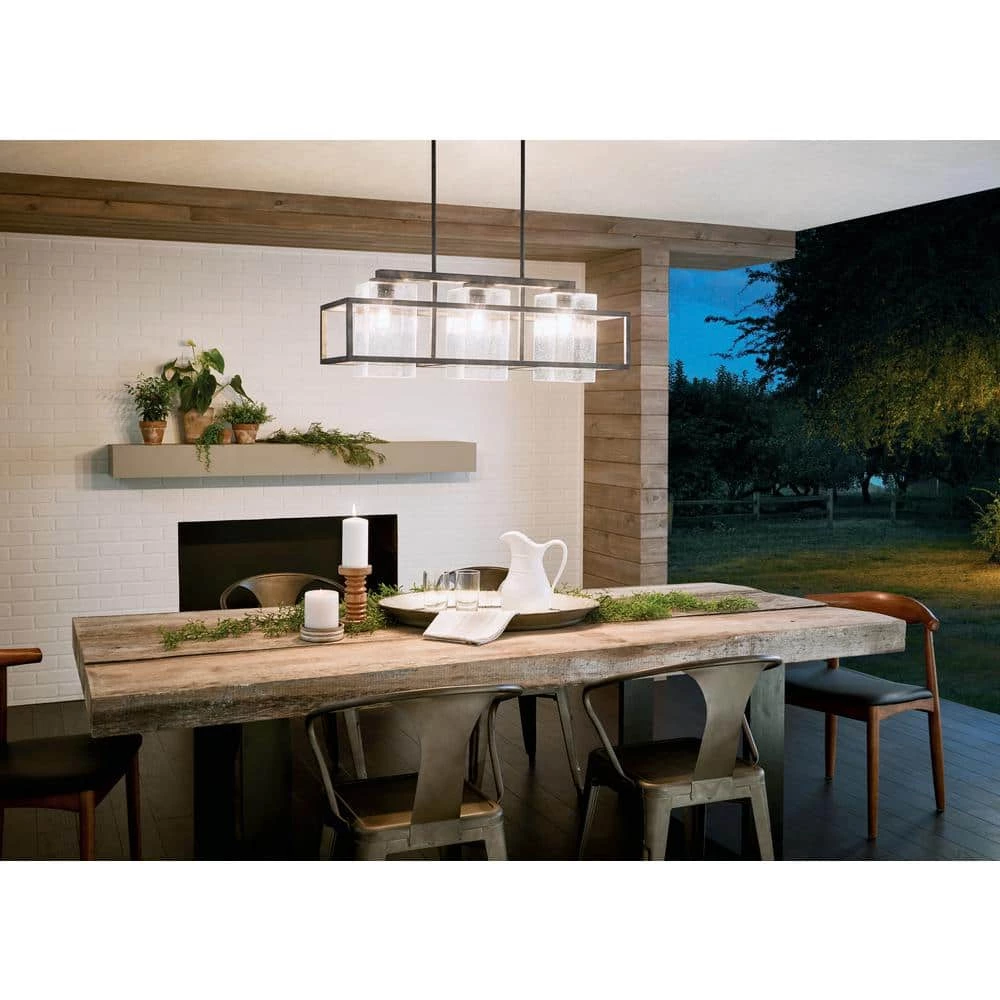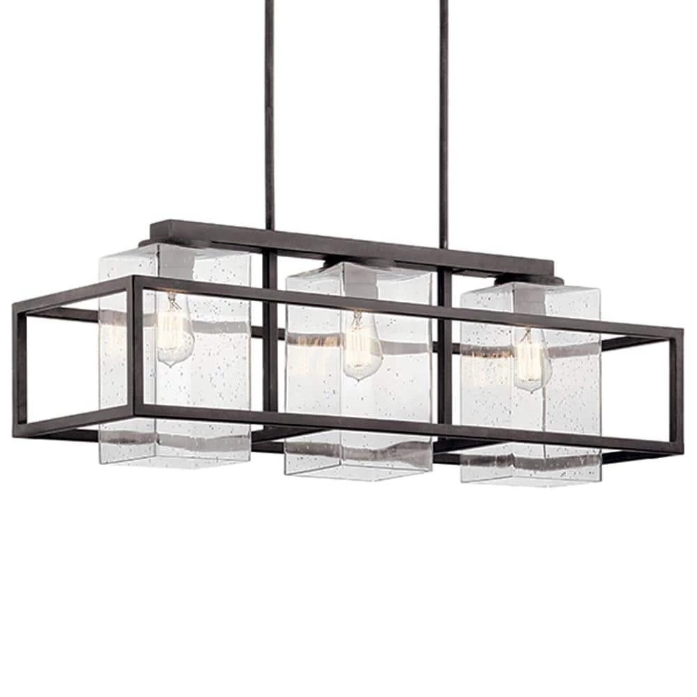 The Kichler Wright 3-Light Weathered Zinc Linear Chandelier features a geometric design that adds a subtle charm to your space. Its clear seeded glass diffuser provides bright downlighting. This linear chandelier is made from steel that offers excellent strength and durability. It is ideal for illuminating your indoor kitchen island or outdoor living area.